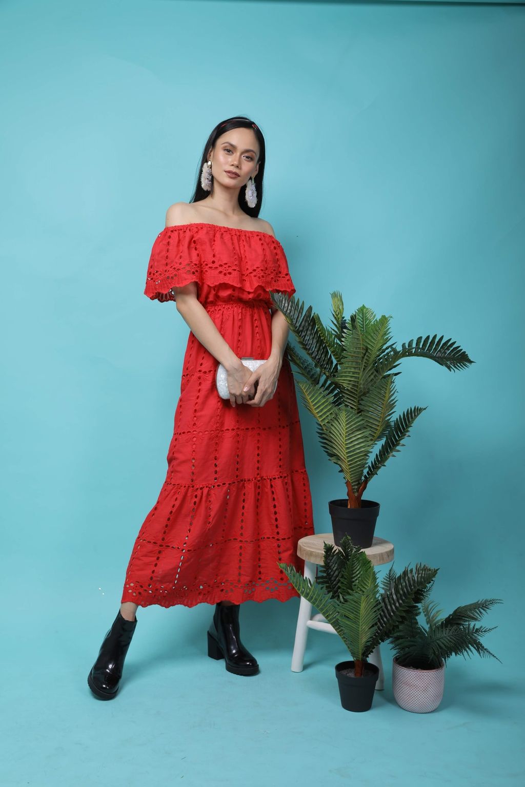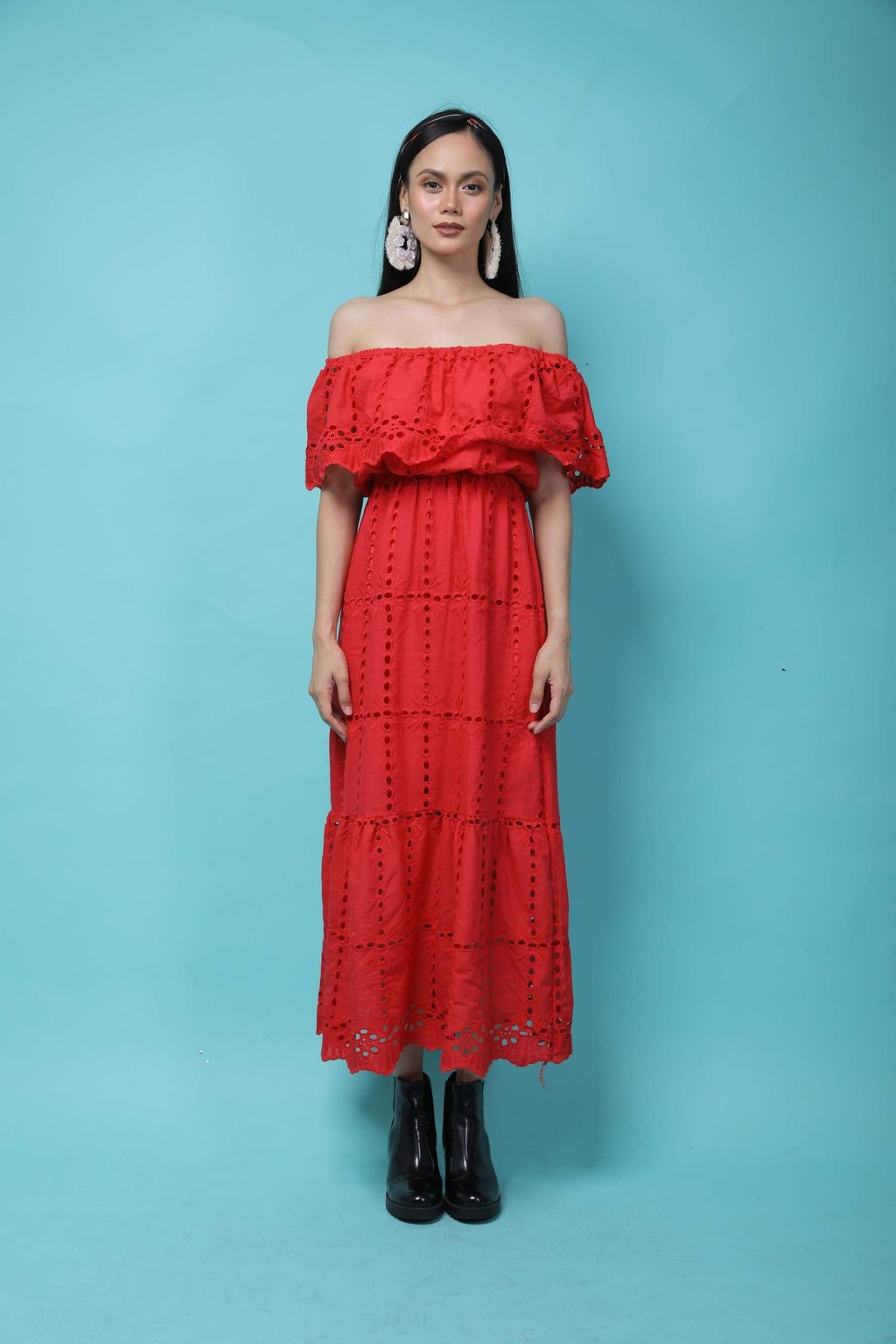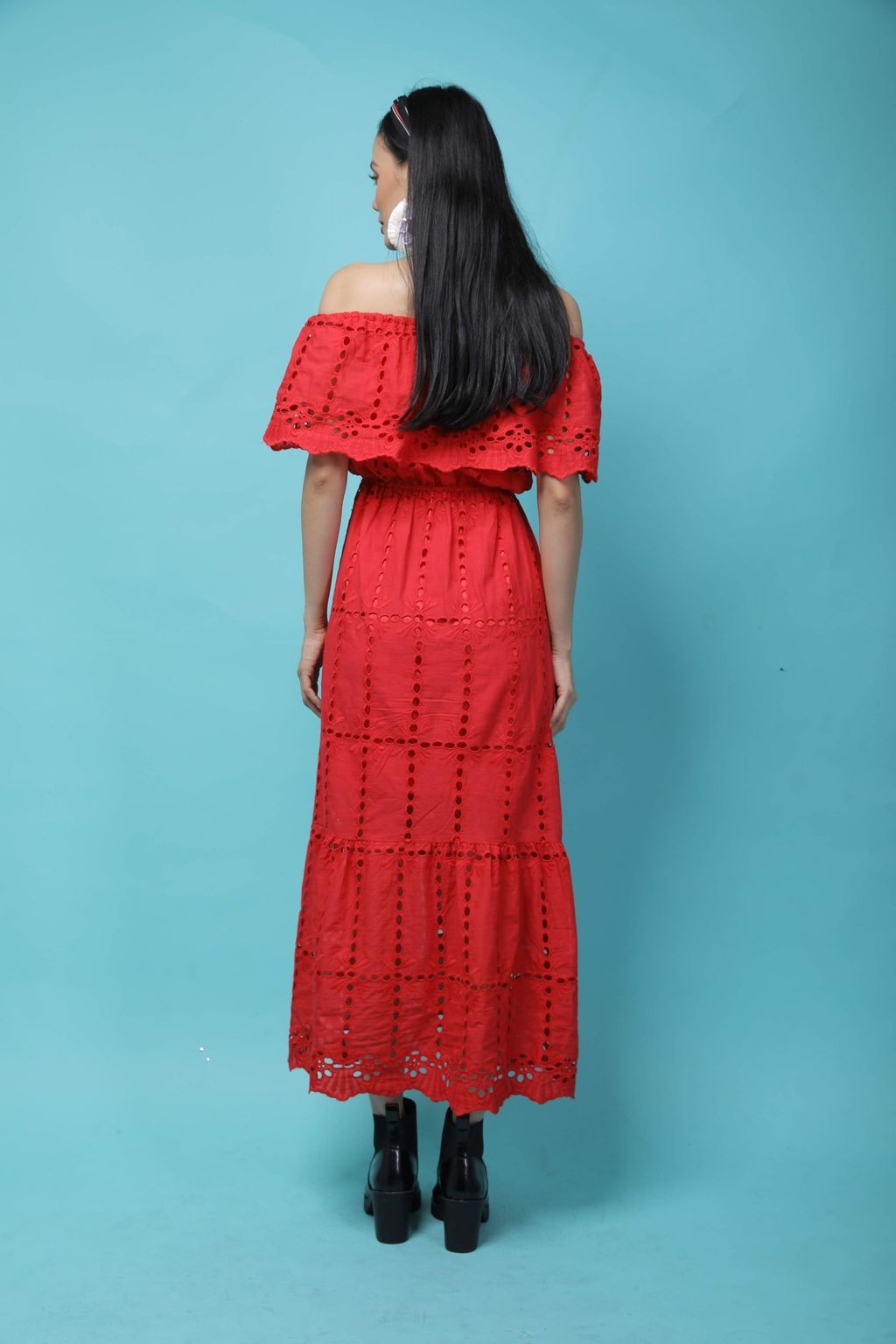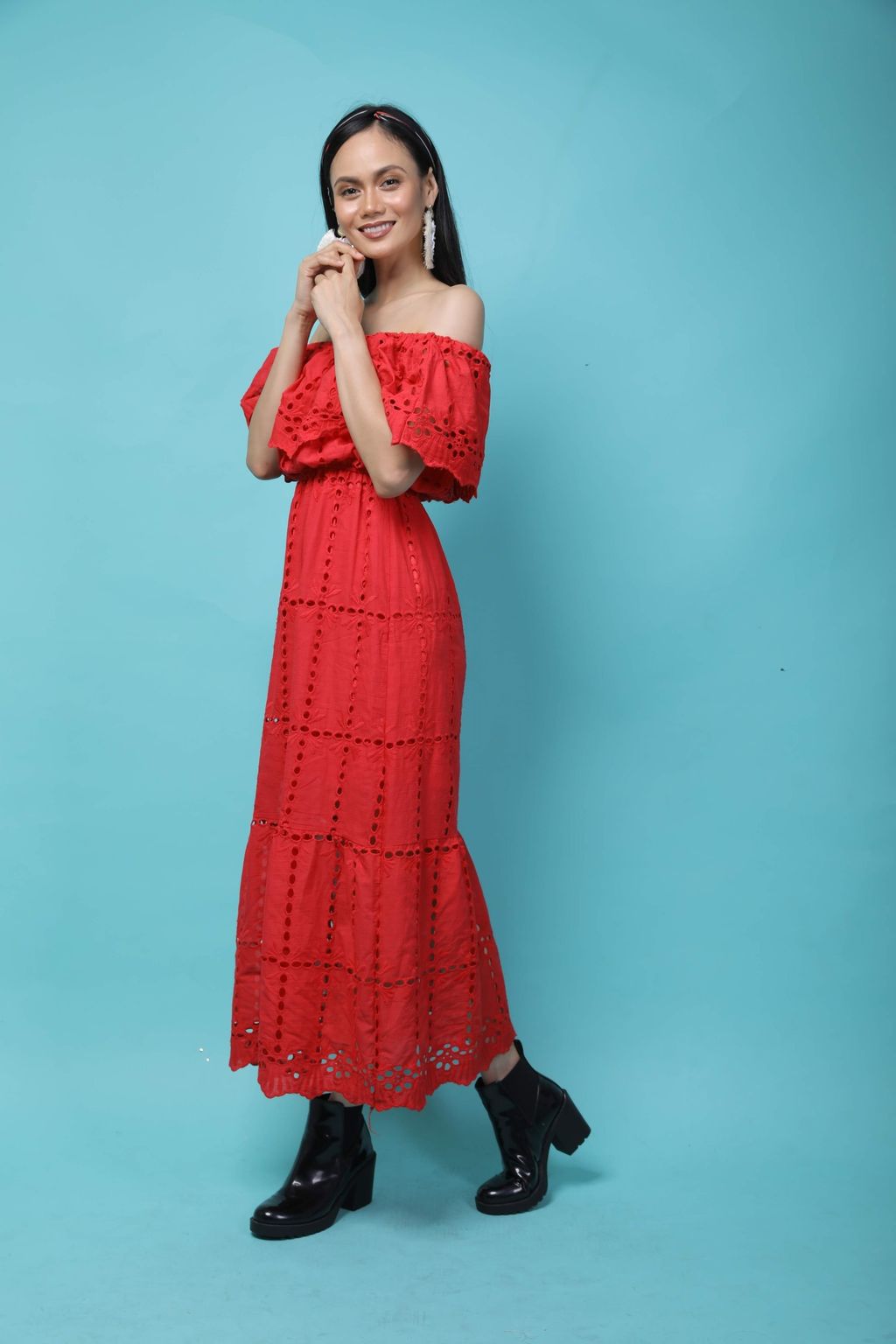 This off-shoulder dress with embroidery details is a head-turner. Stand out from the crowd in this attire and be the ball of the party.