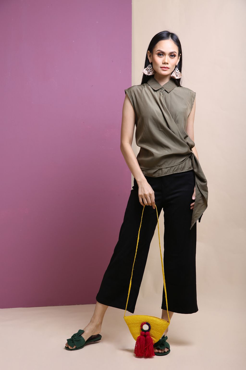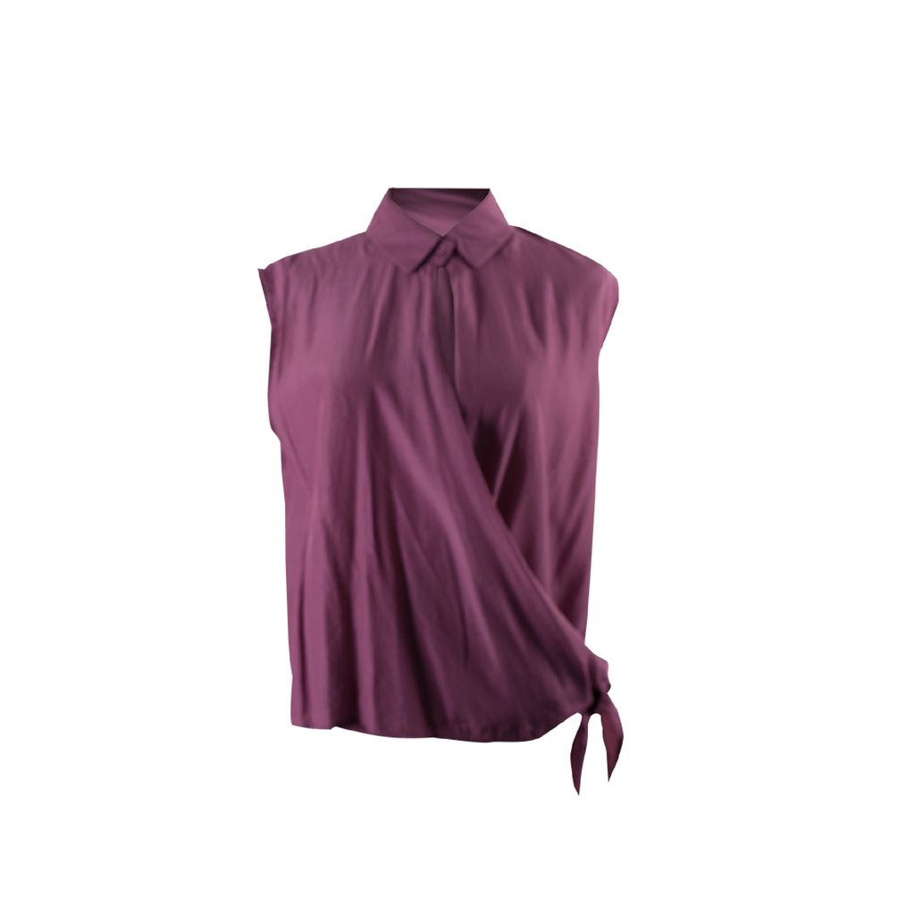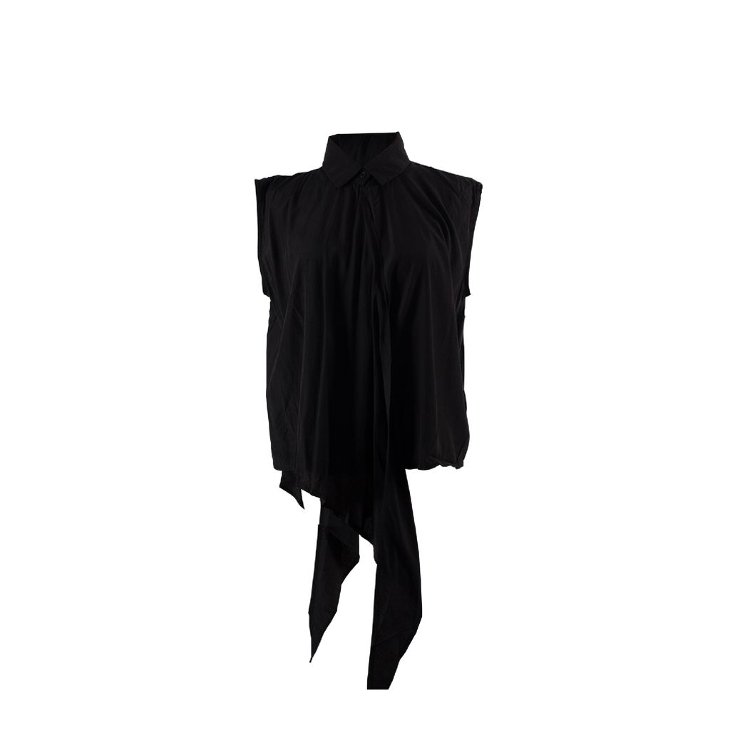 Be a bit dramatic with this sleeveless top that features a collared and button closure. Pair it with any of your favorite pants and don't forget your sling bag.