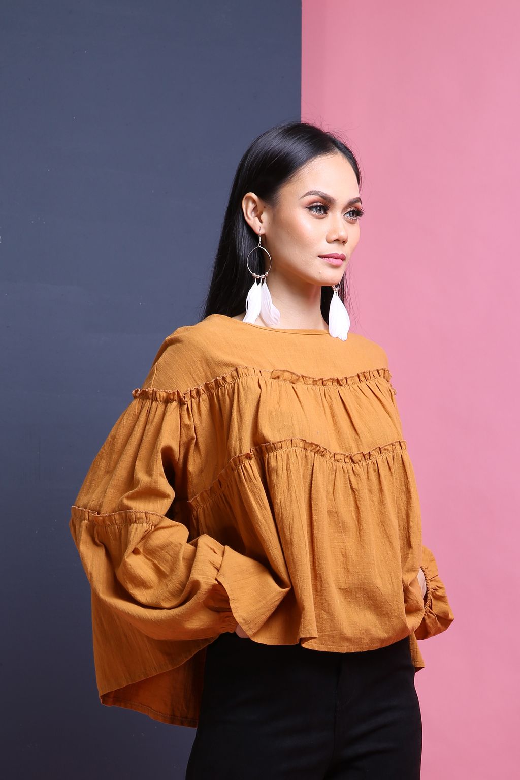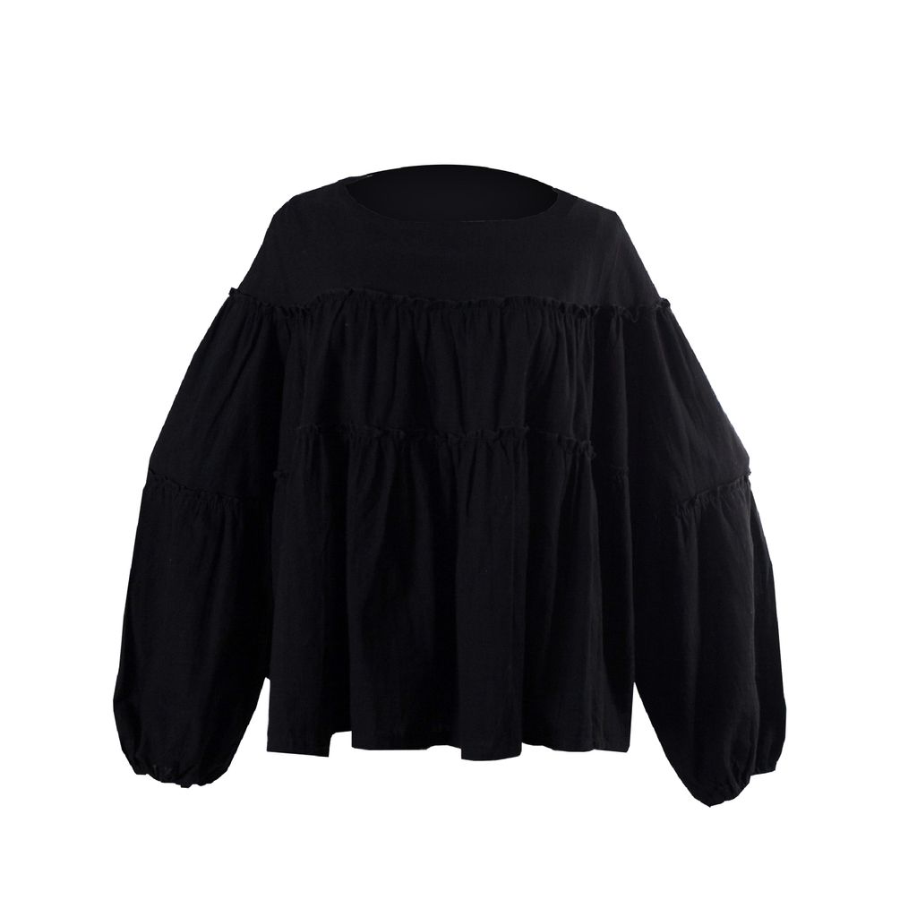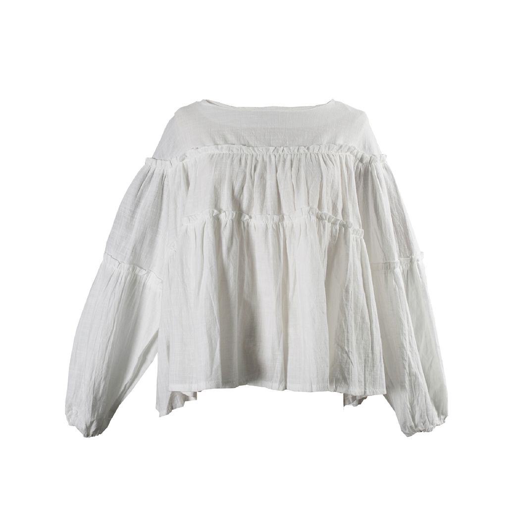 An oversized top with ruffled detailing comes in cotton material. Can be worn with skirts and any of your pants.