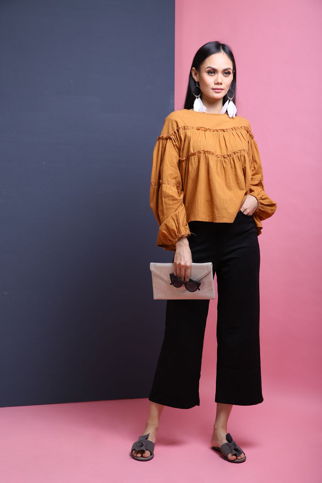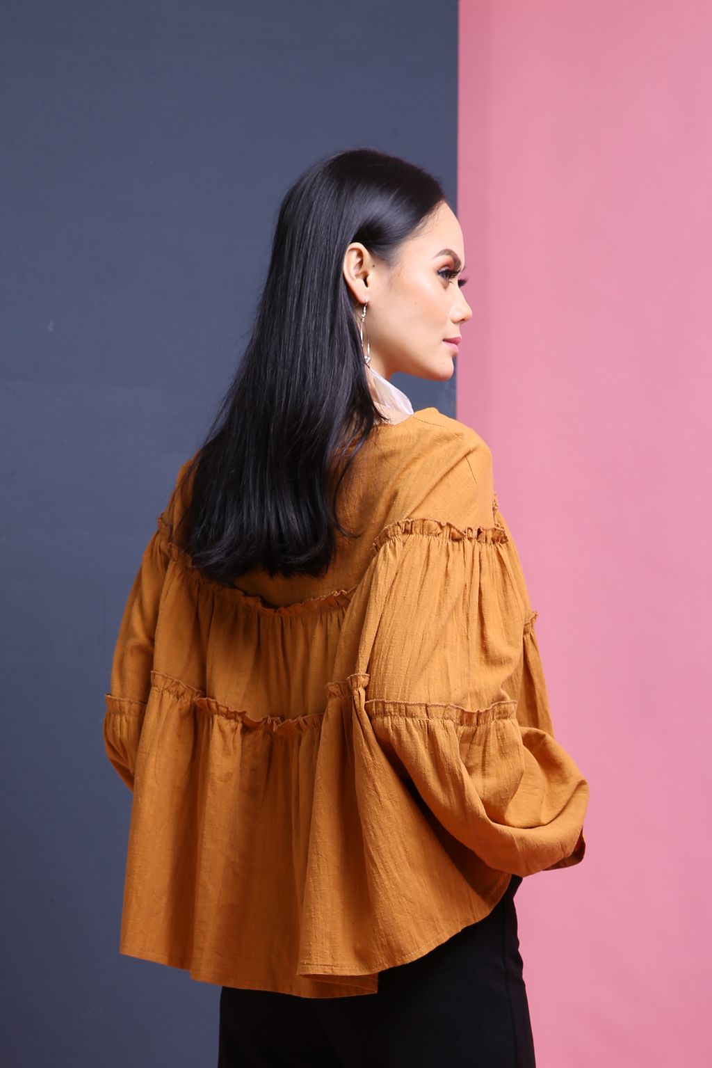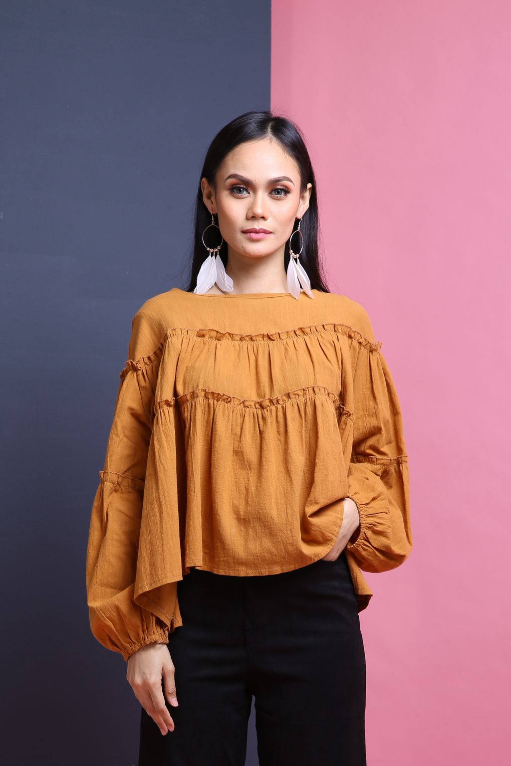 An oversized top with ruffled detailing comes in cotton material. Can be worn with skirts and any of your pants.