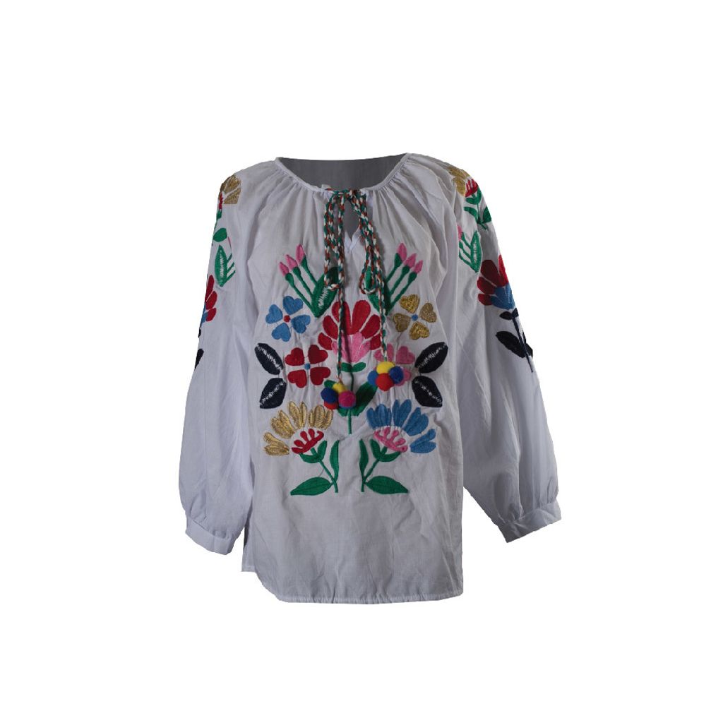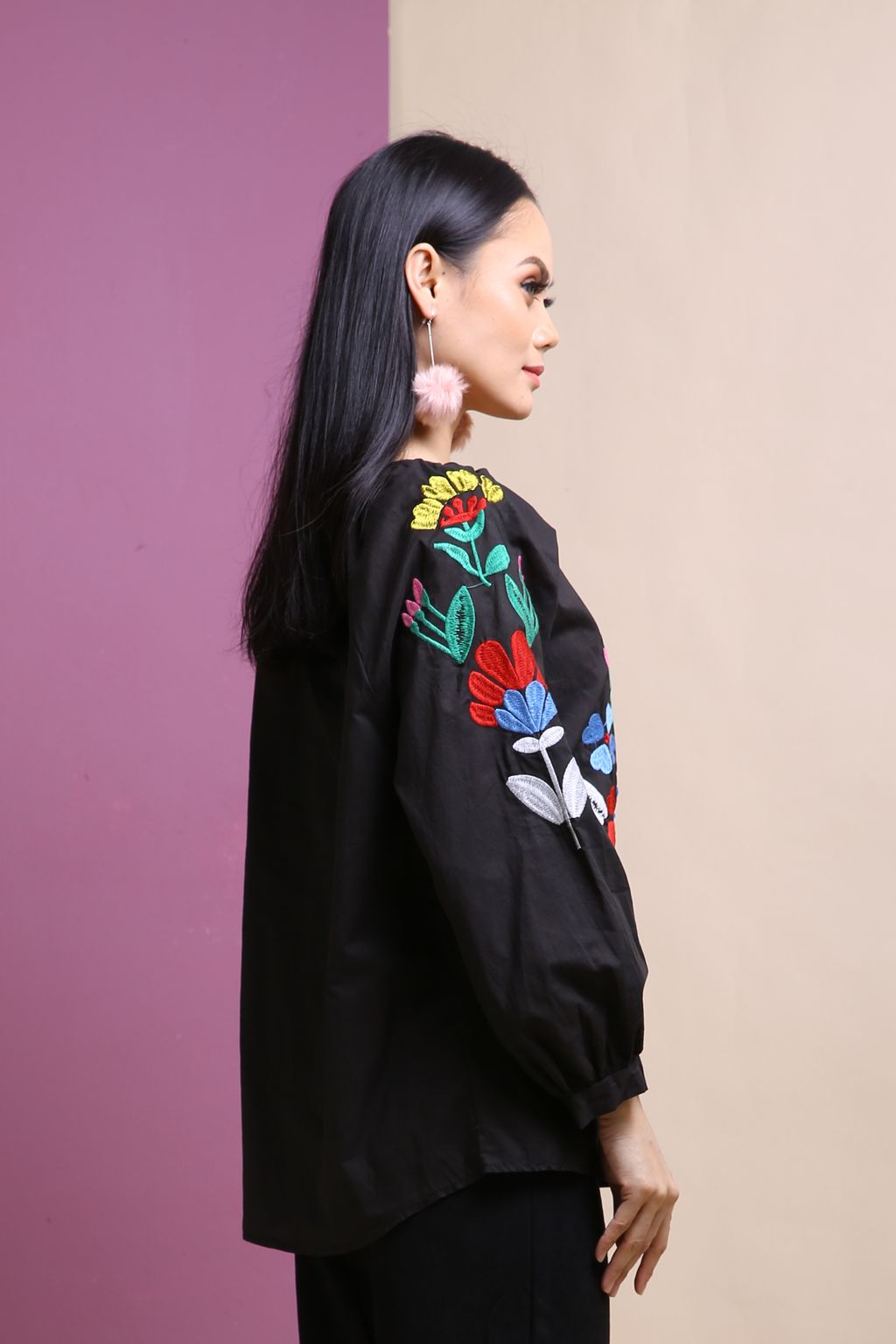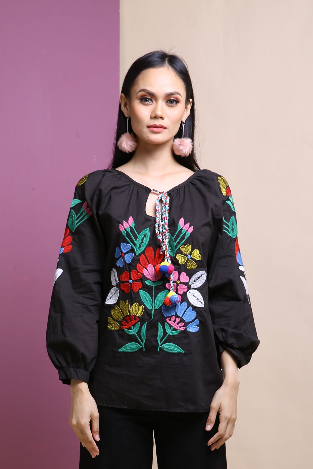 A cotton material top featuring flower embroidery. The neckline can be adjusted.