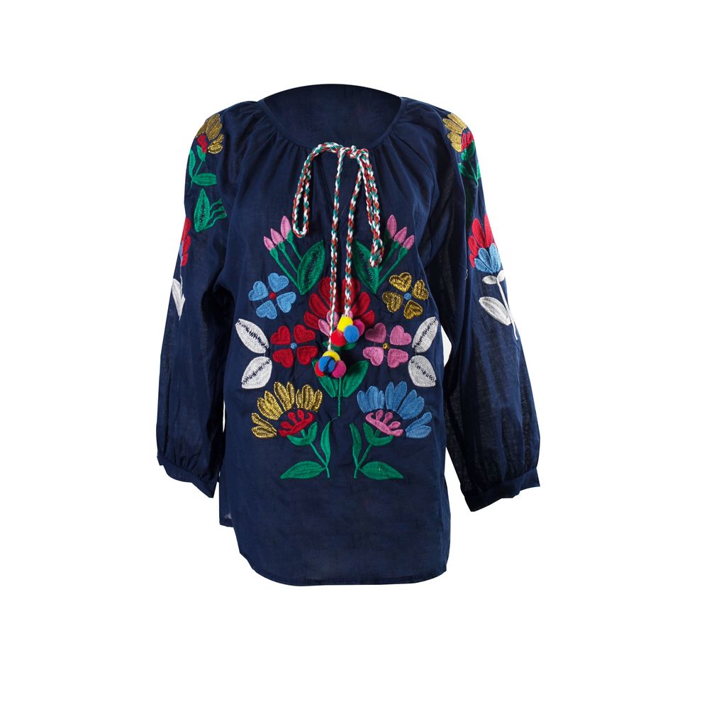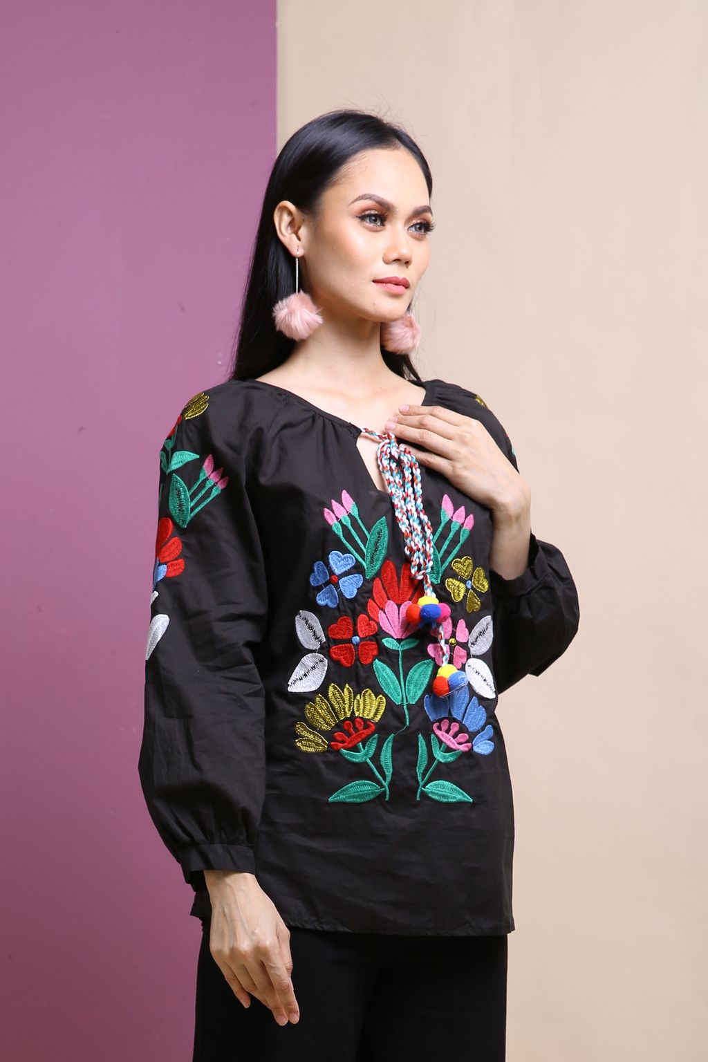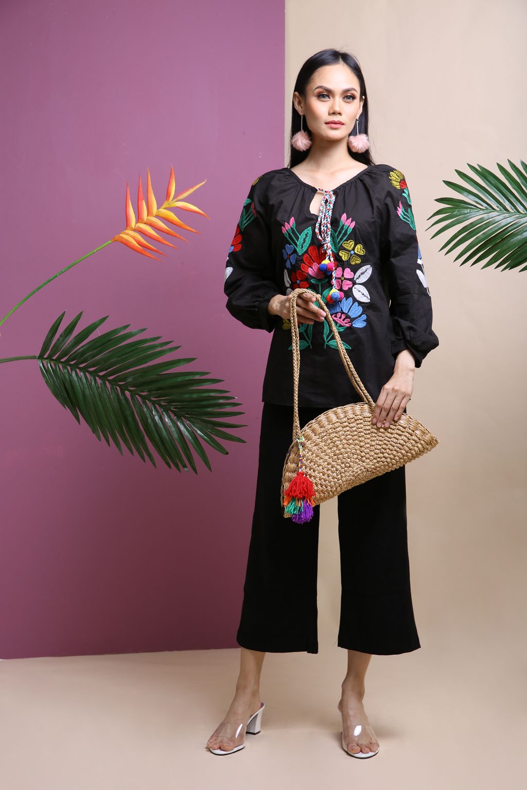 A cotton material top featuring flower embroidery. The neckline can be adjusted.