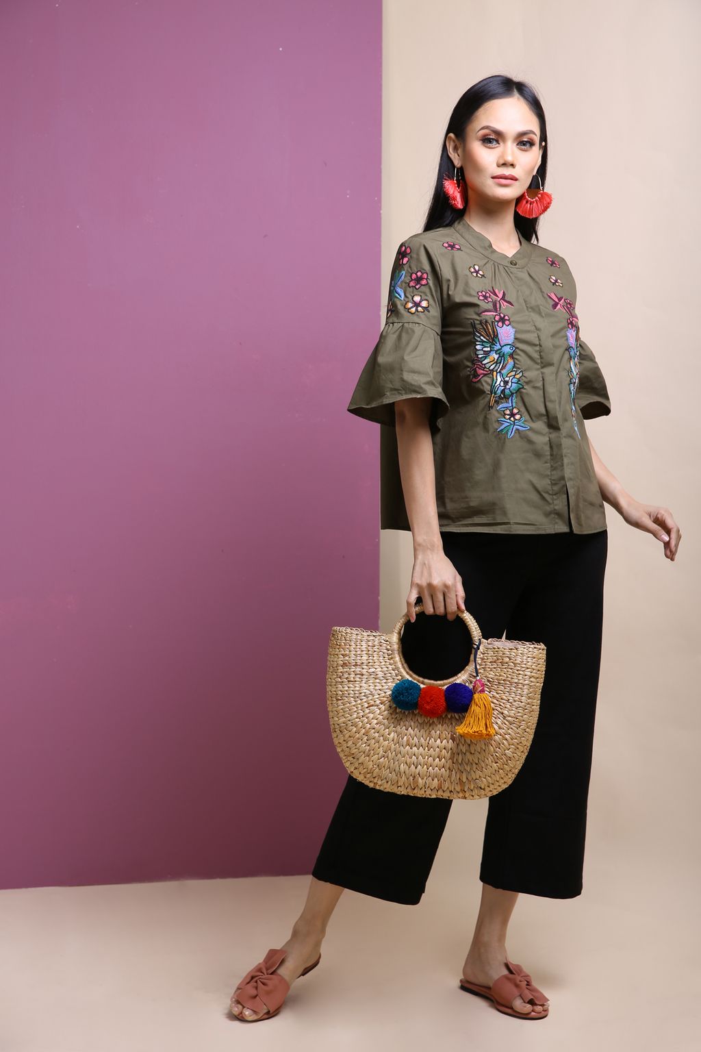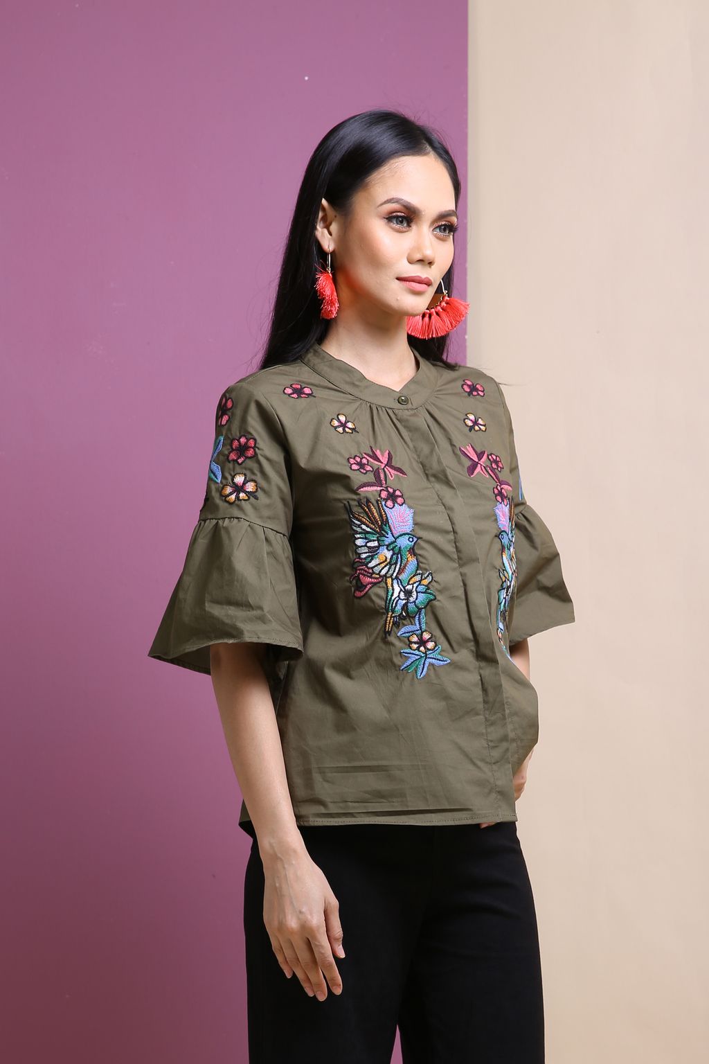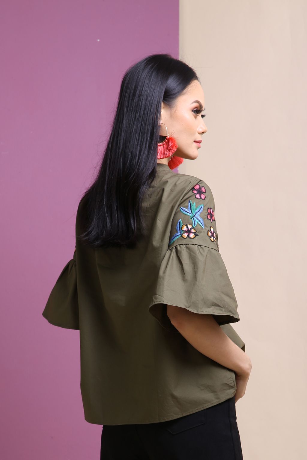 A bell sleeved top that features a flower embroidered detailing and hidden button closure at the front. Comes in cotton material that perfect to match with any types of pants.