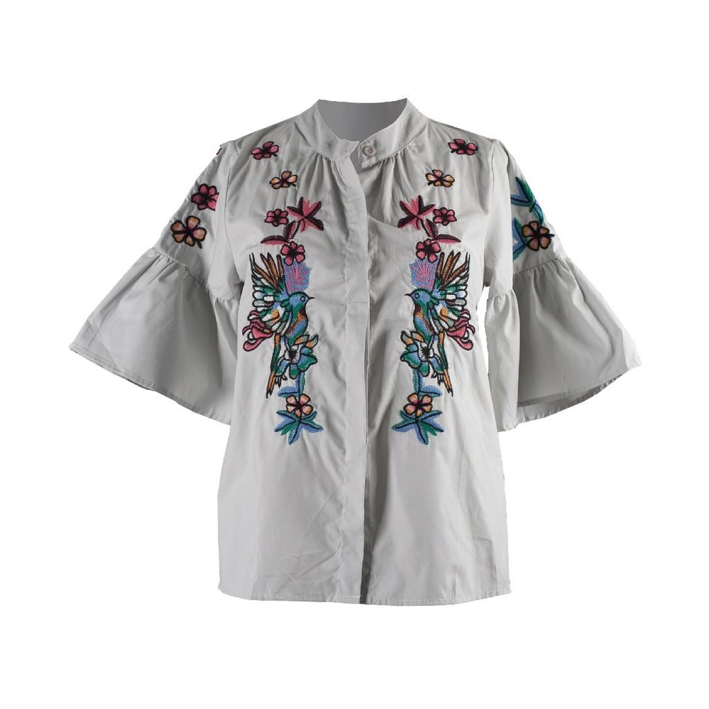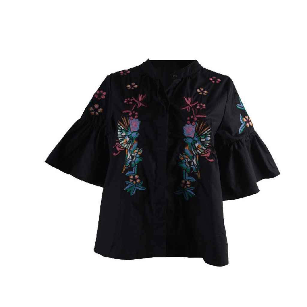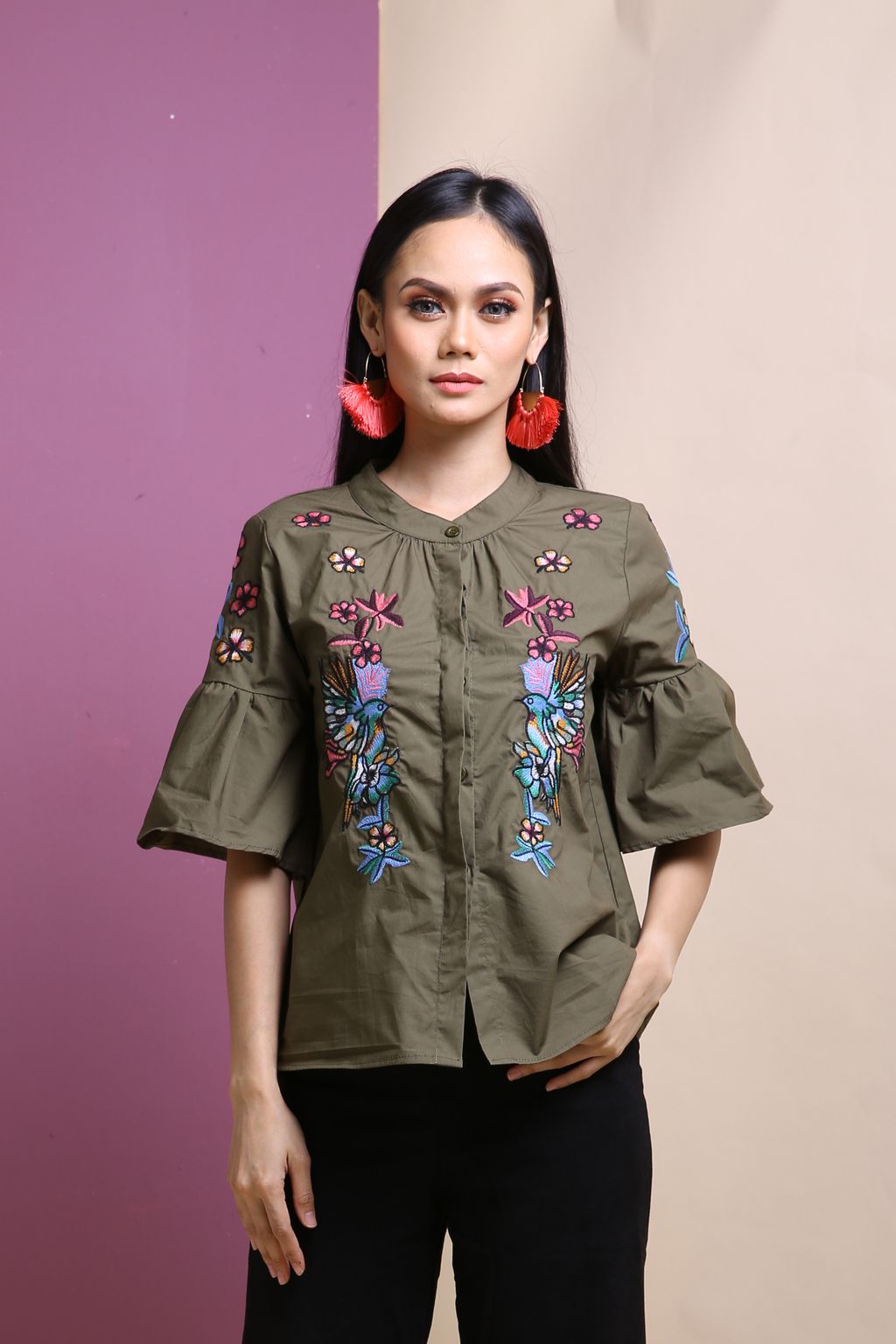 A bell sleeved top that features a flower embroidered detailing and hidden button closure at the front. Comes in cotton material that perfect to match with any types of pants.