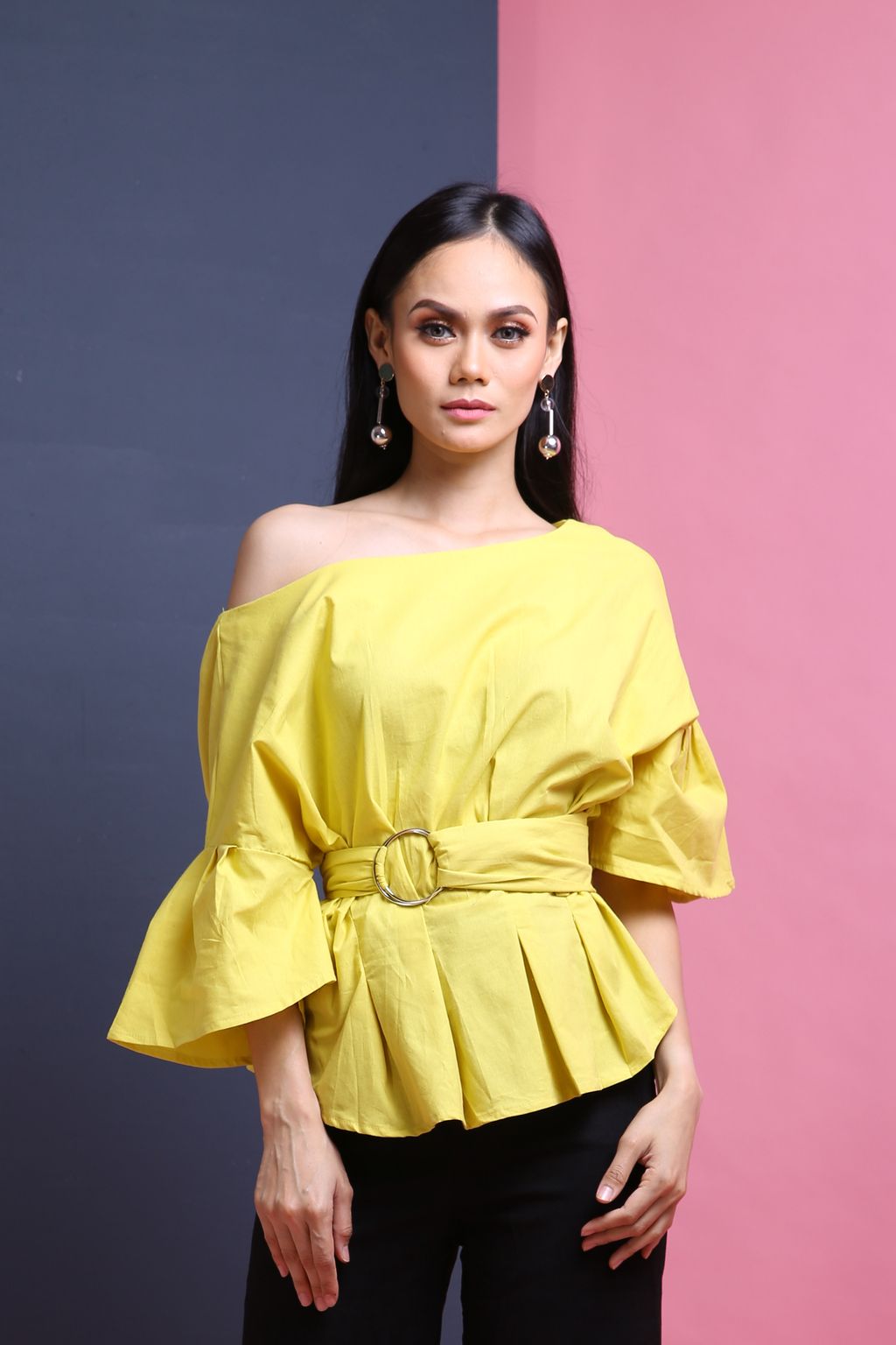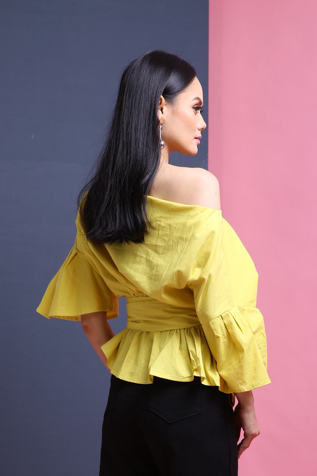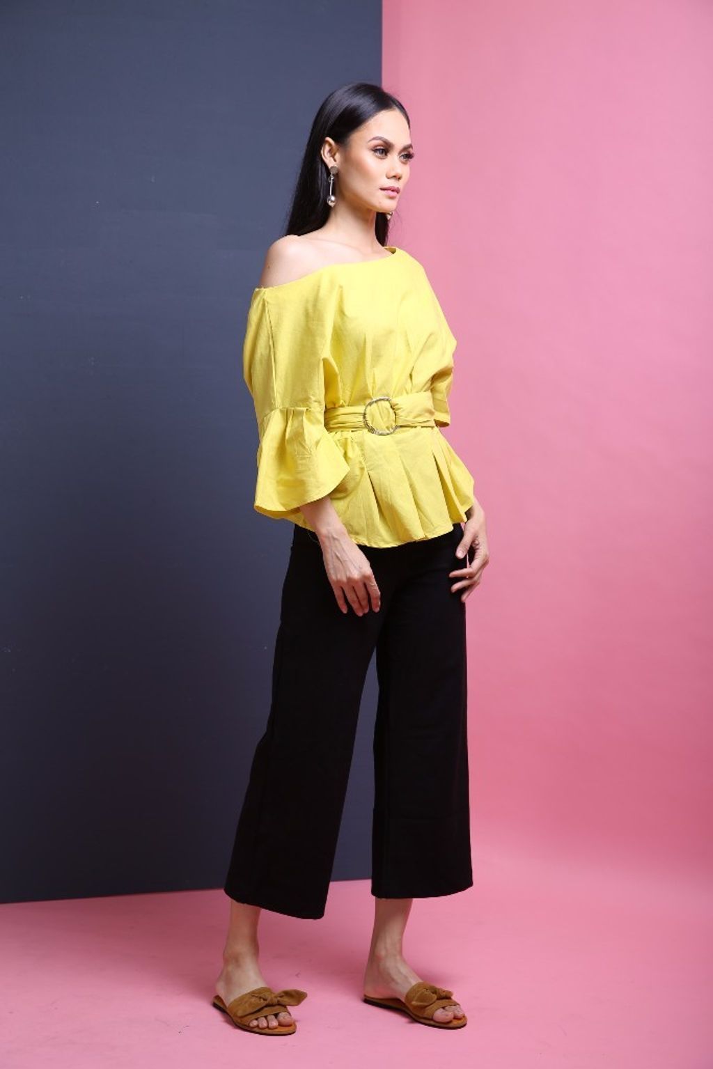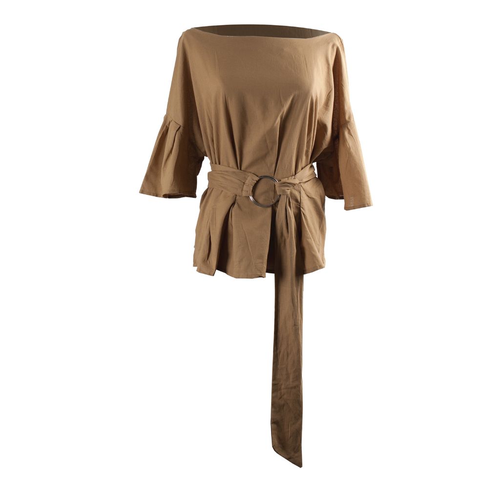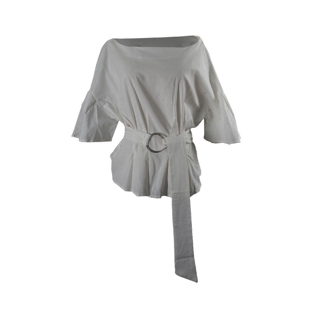 The cotton top that features a bell sleeves with pleated detailing and a bateau neckline. Comes with separated wrap rope.