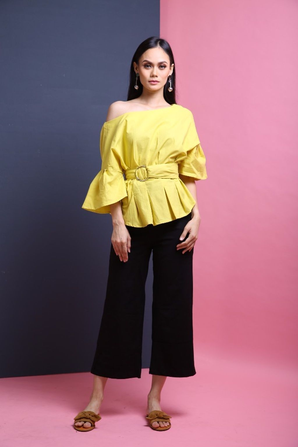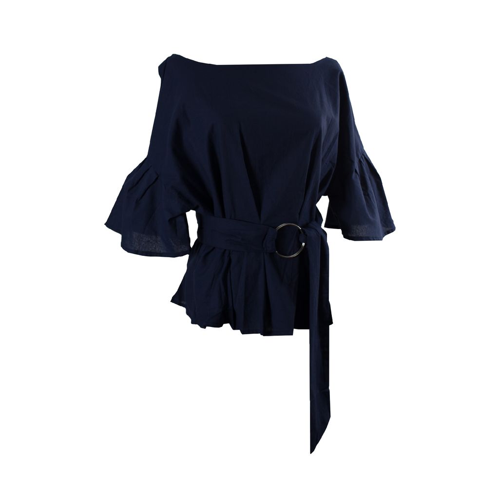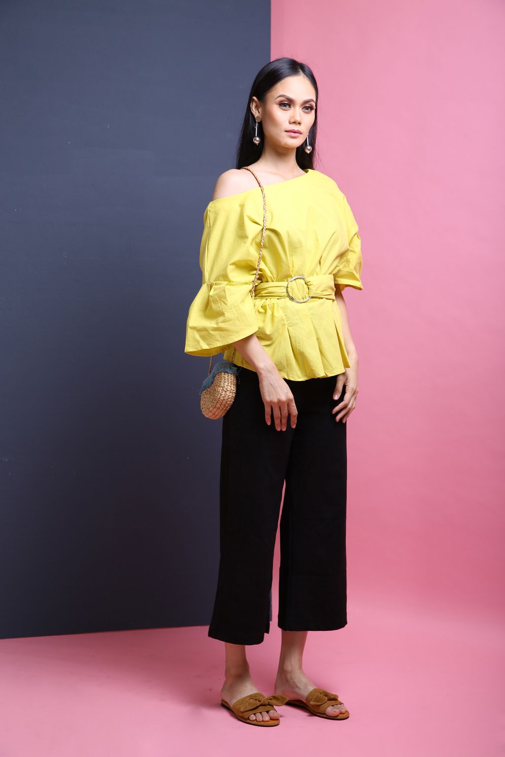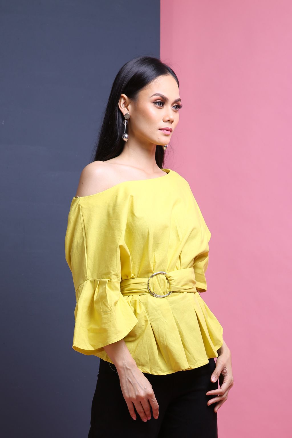 The cotton top that features a bell sleeves with pleated detailing and a bateau neckline. Comes with separated wrap rope.