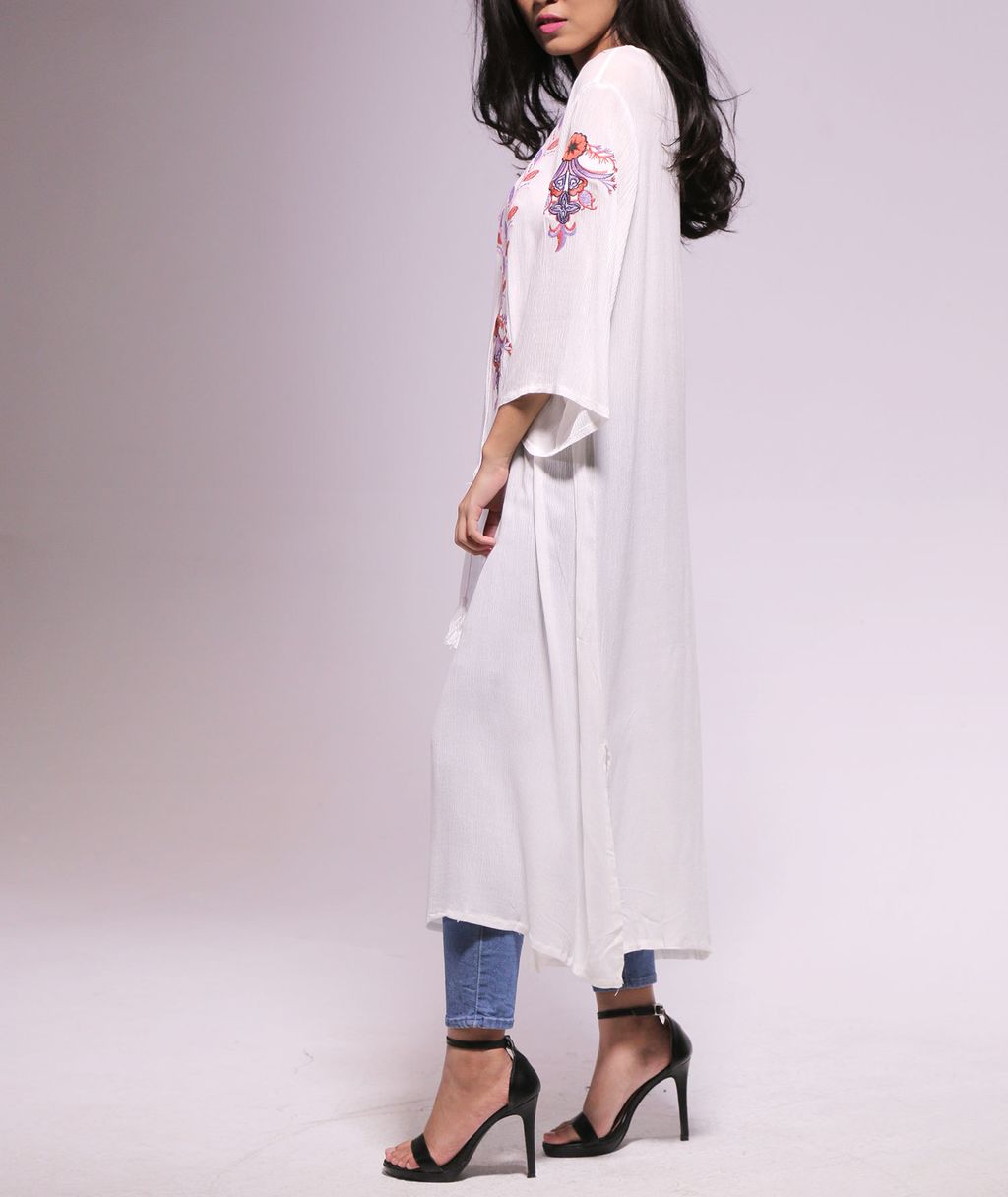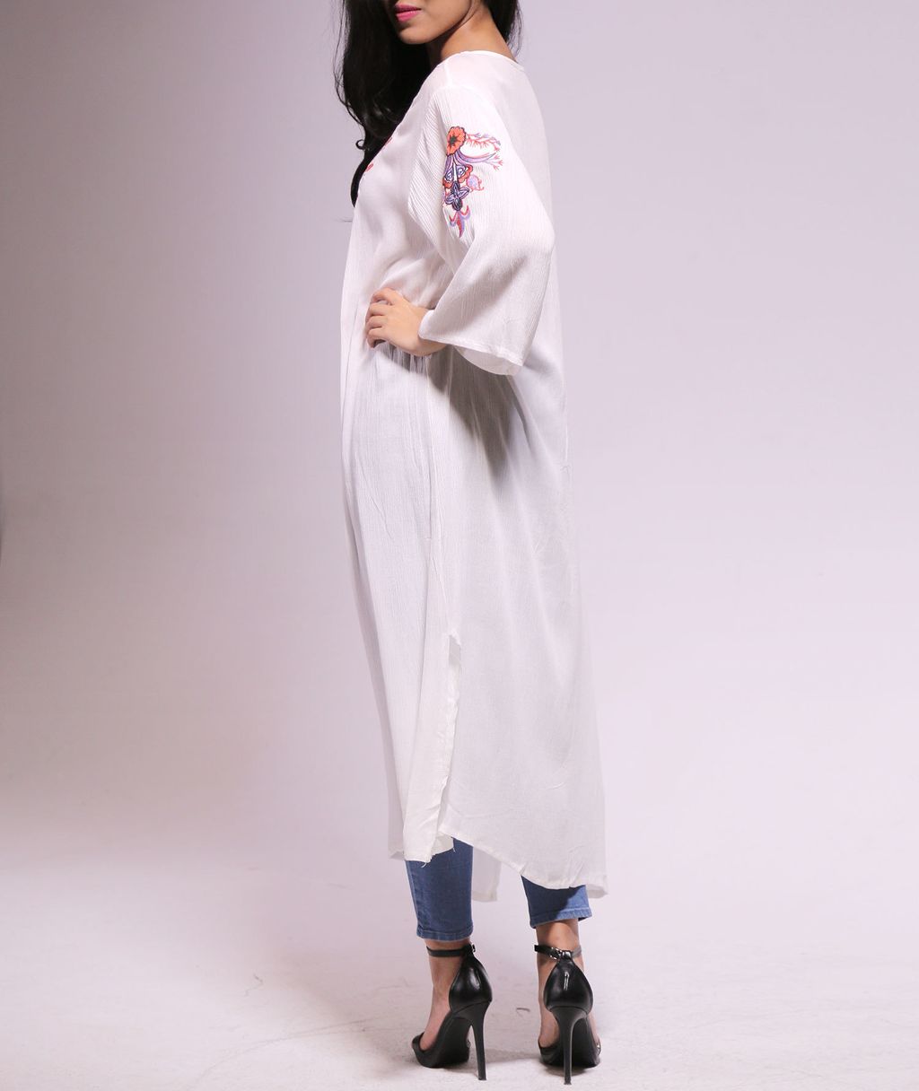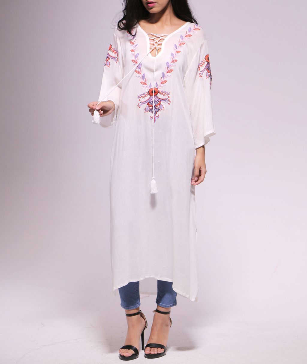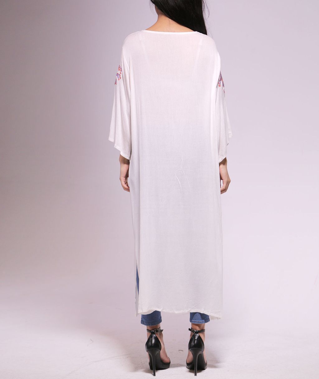 V FrontFront tie with tasslesEmbroidery on sleeves and frontSlits on the sideMidi CutShoulder 43cmBust 53cmSleeves 39cmLength 116cmWaist 53cmHip 53cm